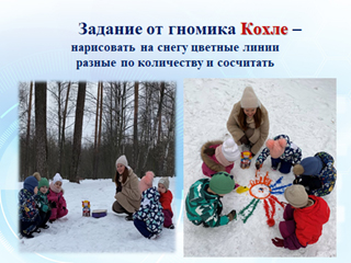 На следующий день к детям пришел гномик Кохле и сказал, какое будет первое задание. На прогулке детям надо было нарисовать цветными красками линии на снегу: одну желтую, две зеленые, три красные, четыре синие, пять оранжевых линий. После этого дети вместе должны сосчитать, сколько линий каждого цвета нарисовано. По окончании выполнения задания, гномик Кохле дал красную фишку детям. Забавушка и дети прикрепили ее на карте выполнения заданий.