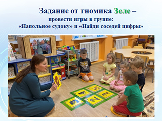 Следующая игра «Найди соседей цифры», закрываются одна цифра карточкой, ребенку предлагается назвать соседей закрытой цифры и цифру, которая спрятана. Игра повторяется несколько раз (с каждым ребенком). По окончании выполнения задания, гномик Зеле дает зеленую фишку детям и Забавушке, которую они прикрепляют ее на карте.