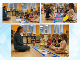 В спортивном зале гномик Геле предложил детям выполнить пятое задание, поиграть в игру «Прыгай по кочкам». Для этого детям необходимо выстроить на полу цветовой ряд из цветных массажных ковриков по образцу воспитателя (на полу уже лежат 4 коврика: желтый, зеленый, синий, красный). Дети раскладывают цветовой раз из ковриков, затем по очереди прыгают по ним и считают каждый свой цвет: один ребенок считает, сколько синих ковриков, другой ребенок считает, сколько зеленых и т.д. Ковриков разное количество, дети считают и сравнивают, каких больше, каких меньше.