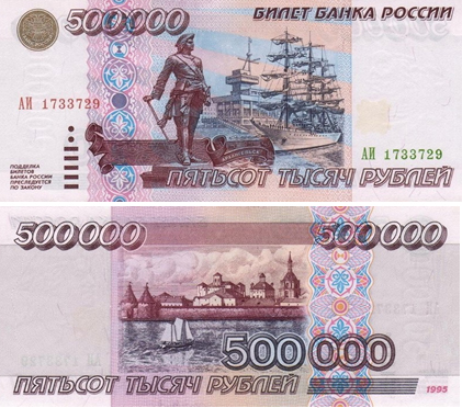 Купюра в 100 тысяч рублей должна была стать самой крупной, но из-за растущей инфляции в 1997 году было принято решение о выпуске 500-тысячной купюры с изображением памятника Петру I на фоне парусника в порту Архангельска, на оборотной стороне - Соловецкий монастырь. Эта купюра является самой крупной купюрой современной России.