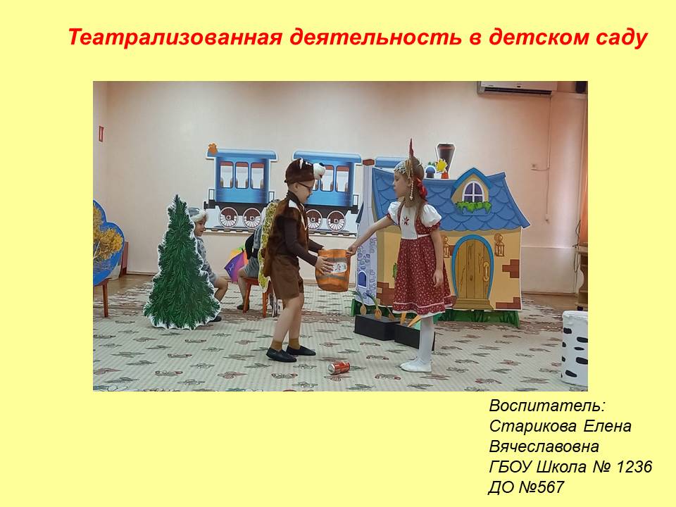 Театрализованная деятельность в детском саду Старикова Елена Вячеславовна Разделы: Литература, Дополнительное образование Класс: д/с Ключевые слова: театрализованная деятельность Работа выполнена в форме презентации 13.02.2025