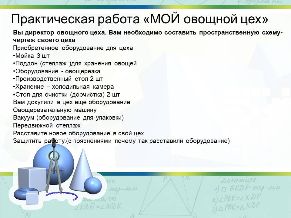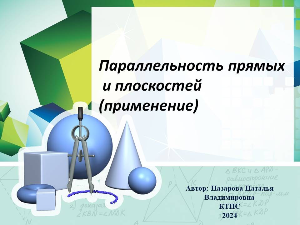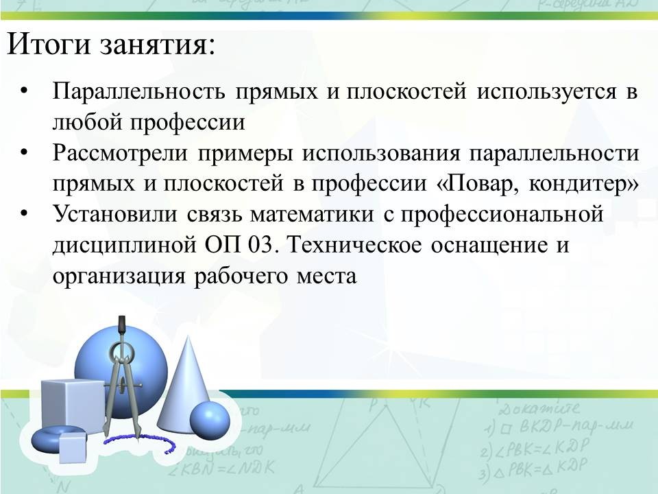 Методическая разработка открытого занятия «Параллельность прямых и плоскостей в профессиональных помещениях» демонстрирует возможности приобретения опыта практической деятельности студентами 2 курса специальности 43.01.09. «Повар, кондитер» при изучении раздела 5 «Прямые и плоскости в пространстве».