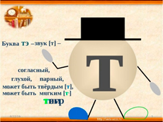 - Ребята, а может кто-то знает, какой буквой обозначается звук (Т) на письме?