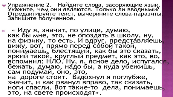 Слова-паразиты – это слова или словосочетания, вносимые в речь, но не несущие никакой смысловой нагрузки. Такое явление наблюдается в связи с недостаточной речевой культурой говорящего или в связи с тем, что говорящий затрудняется в выборе слова, не решается определённо высказать мысль.