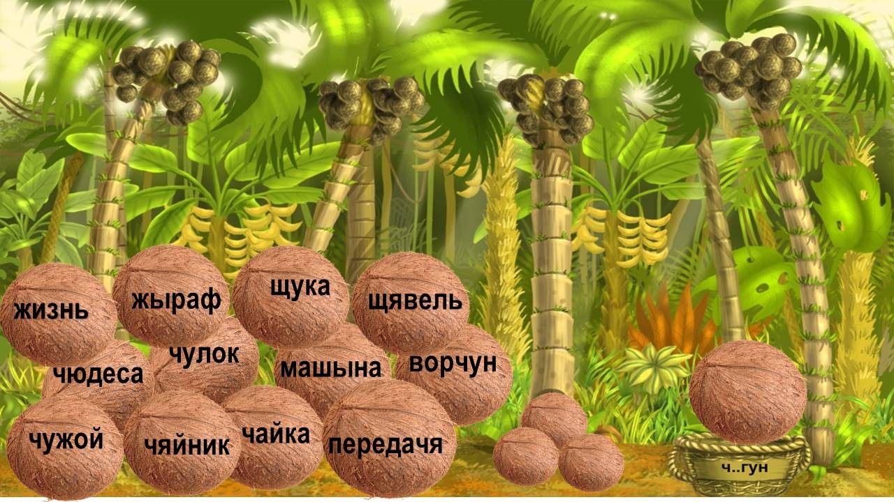 Необходимо собрать все спелые кокосы (верно написанные - раскрасить), исправить ошибки.