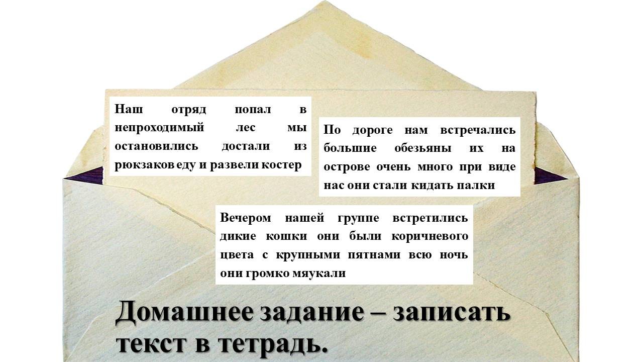 Учитель: Смотрите, к нам летит попугай, но не простой, а почтовый. Он принес нам письма. Кто знает для чего пишутся письма? попугай принес не простые письма. В них нужно правильно найти предложения, поставить точки и исправить ошибки!
