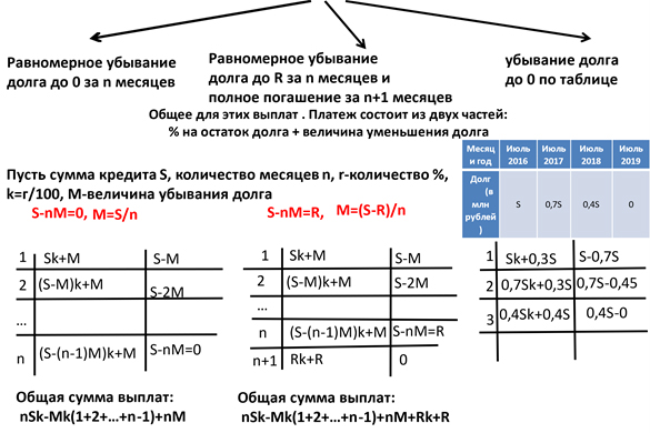 Пусть S — кредит. n месяцев долг убывал равномерно до какой-то величины R. М-величина убывания долга, r-количество %, k=r/100 и в n+1 месяц полностью погасили кредит.