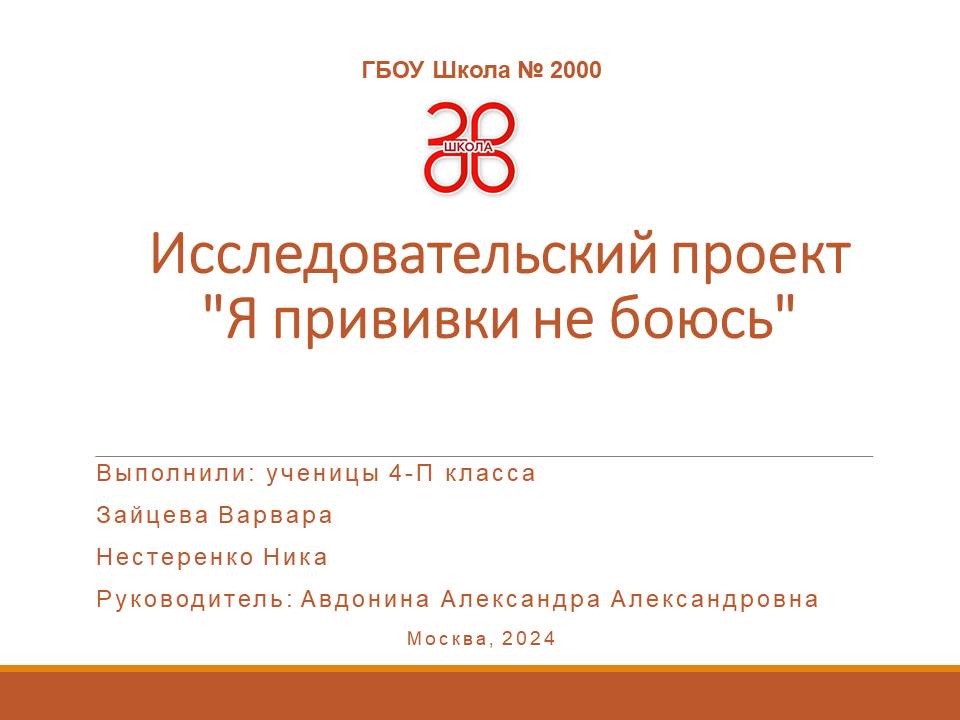 Исследовательский проект: "Я прививки не боюсь" Авдонина Александра Александровна, учитель начальных классов Разделы: Начальная школа, Руководство учебным проектом, Классный час «Поговорим о главном» Класс: 4 Работа выполнена в форме презентации 17.02.2025