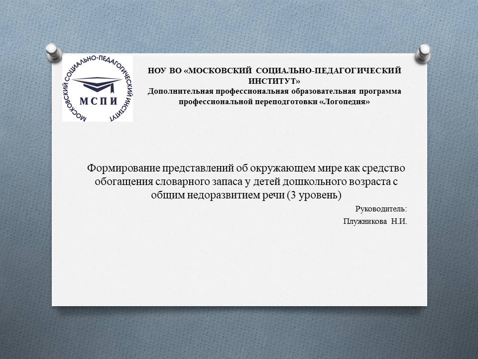 Формирование представлений об окружающем мире как средство обогащения словарного запаса у детей дошкольного возраста с общим недоразвитием речи (3 уровень) Плужникова Наталья Ивановна Разделы: Дополнительное образование Работа выполнена в форме презентации 19.02.2025
