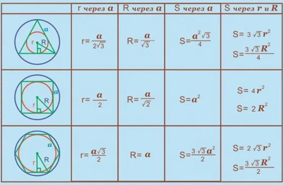 Формулы для вычисления площади правильного многоугольника, его стороны и радиуса вписанной окружности