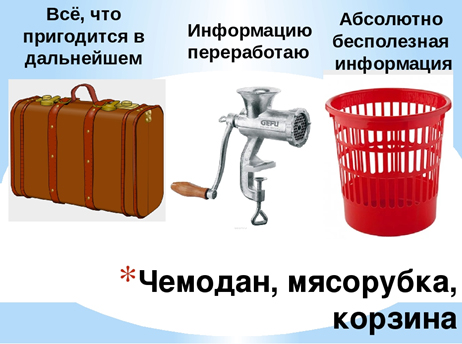 А перед тем, как закончить урок предлагаю вам высказать ваши мысли о нашем уроке. С помощью такого слайда. Расскажите какие знания с сегодняшнего урока вы бы взяли в чемодан, сложи в мясорубку или выкинули в корзину.