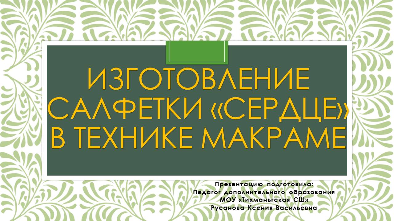 Презентация на тему «Изготовление салфетки "Сердце" в технике макраме» Русанова Ксения Васильевна, Педагог дополнительного образования Разделы: Мастер-класс Классы: 2, 3, 4, 5, 6, 7, 8, 9, 10, 11 Работа выполнена в форме презентации 20.02.2025