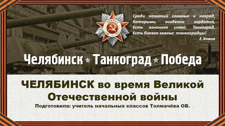 Челябинск во время Великой Отечественной войны Толмачёва Ольга Викторовна, учитель начальных классов Разделы: Начальная школа, Патриотическое воспитание, К 80-летию Победы в Великой Отечественной войне Класс: 3 Ключевые слова: Великая Отечественная война 1941-1945 гг. Работа выполнена в форме презентации 20.02.2025