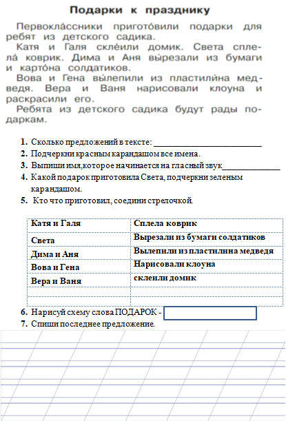 Рабочий лист к тексту "Подарок к празднику". Азбука 1 часть, УМК "Школа России" Миронченко Анастасия Николаевна Разделы: Начальная школа Класс: 1 Ключевые слова: УМК «Школа России» 21.02.2025
