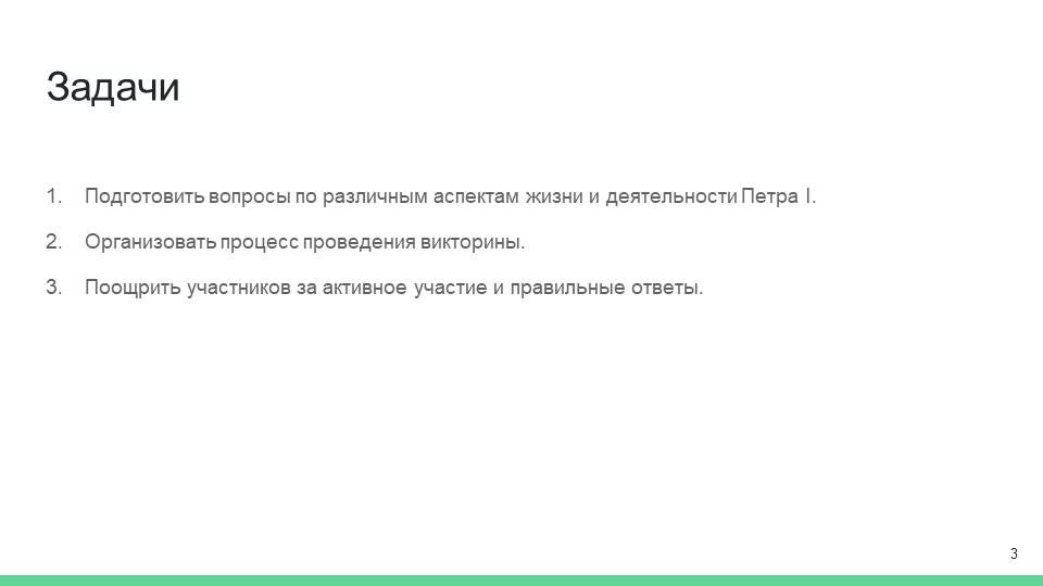 Ключевой целью викторины становится развитие критического мышления, а также повышение познавательной активности. Учитывая специфику исторической викторины, вопросы формируются таким образом, чтобы не просто повторить изученный материал, а сделать это в формате, который позволяет участникам задуматься над мотивами, последствиями и значением тех или иных действий Петра I. Таким образом, игра дает возможность не только повторить факты, но и увидеть их более широкую картину, взаимодействие с другими событиями и личностями, что содействует формированию исторической памяти [2].