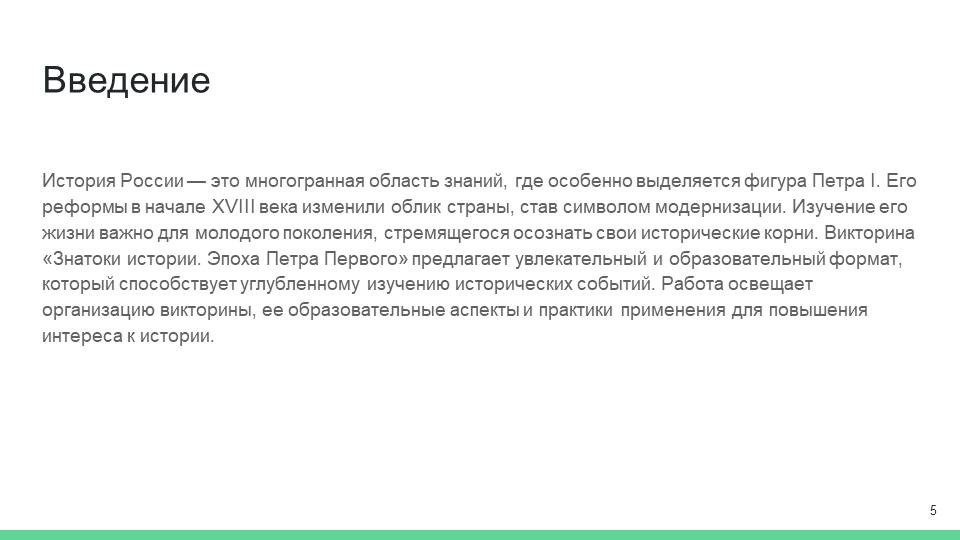 Таким образом, данная работа направлена на создание эффективного инструмента для повышения интереса к истории России среди молодежи через организацию викторины, посвященной эпохе Петра I. Важно, чтобы молодое поколение не только знало о значимых событиях и личностях своей страны, но и осознавало их влияние на современность, что, в свою очередь, будет способствовать формированию гражданской позиции и патриотизма.