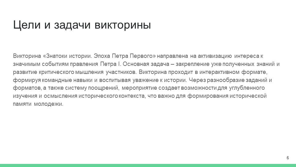 Викторина «Знатоки истории. Эпоха Петра Первого» нацелена на активизацию интереса учеников к важнейшим событиям, связанным с правлением одного из самых значимых правителей России. Основной задачей данного мероприятия является закрепление знаний, которые учащиеся уже приобрели на уроках истории. Воспоминания о судьбоносных преобразованиях, проведённых Петром I, помогут создать более глубокое понимание исторического контекста той эпохи [1].