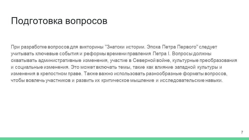 Для создания вопросов викторины «Знатоки истории. Эпоха Петра Первого» важно учитывать ключевые события, фигуры и особенности времени правления Петра I. Вопросы необходимо формулировать так, чтобы они способствовали активному опыту участников, помогая им лучше понять и запомнить изучаемый материал.
