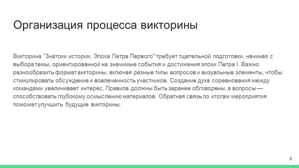 Организация викторины «Знатоки истории. Эпоха Петра Первого» требует тщательной подготовки, чтобы создать атмосферу заинтересованности и познавательной активности участников. Первым шагом в организации является определение самой темы викторины. Поскольку игра посвящена значимой исторической личности, важно сделать акцент на событиях, явлениях и достижениях эпохи Петра I. Актуальность темы позволяет привлечь внимание молодежи, подчеркивая важность изучения истории и её влияния на современность [11].