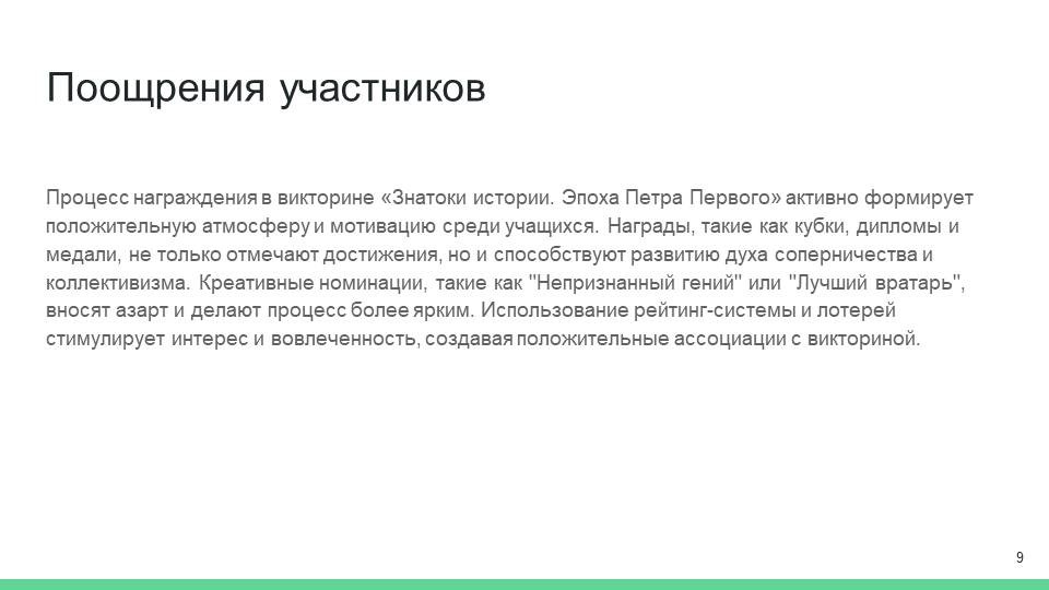 Процесс награждения участников викторины «Знатоки истории. Эпоха Петра Первого» играет важную роль в создании положительной атмосферы и мотивации учащихся. Правильно подобранные награды не только подчеркивают достижения команд, но и способствуют формированию духа соперничества и коллективизма. При разработке системы наград следует учитывать различные аспекты, начиная от внешнего оформления и заканчивая самими номинациями.