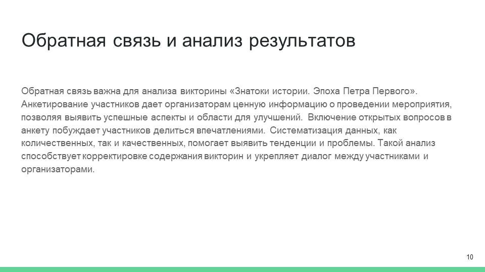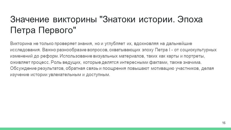 Завершая, можно отметить, что грамотная организация викторины «Знатоки истории. Эпоха Петра Первого» создает возможности не только для проверки знаний, но и для формирования у участников интереса к истории России. Игровой подход в обучении способствует более глубокому усвоению материала и развитию критического мышления, что существенно повышает образовательный уровень молодежи. Успешная викторина станет не только мероприятием для развлечения, но и важным шагом на пути к познанию исторического наследия страны.