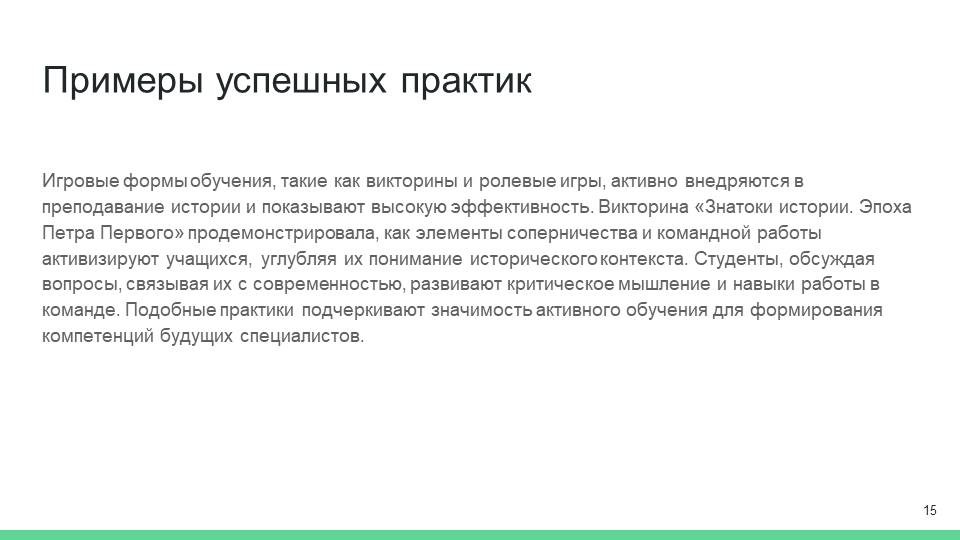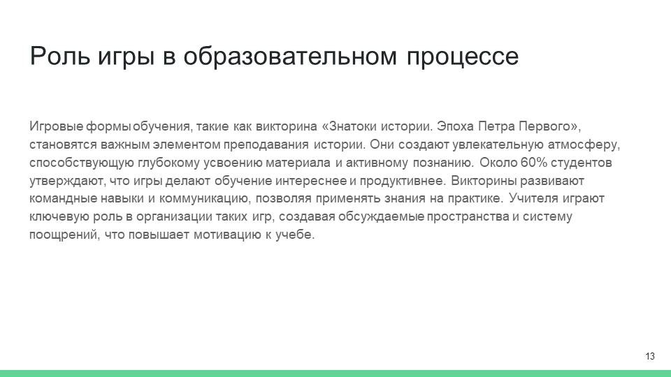 Кроме того, викторина разрабатывается таким образом, чтобы обеспечить разнообразие форматов вопросов и заданий. Это могут быть как открытые вопросы, так и задания, где нужно выбрать правильный ответ из предложенных вариантов. Возможны также более творческие задания, например, создание презентаций или проектирования небольших сценок, которые иллюстрируют определённые моменты из жизни Петра. Такие задания повышают уровень вовлеченности и интереса участников и делают процесс обучения более увлекательным [5].