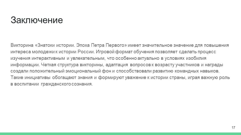 Таким образом, викторина «Знатоки истории. Эпоха Петра Первого» создаёт не только образовательный, но и воспитательный эффект. Она помогает учащимся не только усвоить и закрепить важные исторические факты, но и формирует такие качества, как способность критически мыслить, работать в команде и быть активными участниками образовательного процесса. Важно, чтобы подобные мероприятия продолжали существовать и развиваться, ведь они в значительной степени влияют на отношение молодежи к истории своей страны, способствуют её осмыслению и пониманию [1].