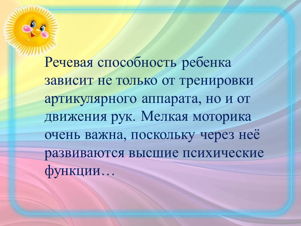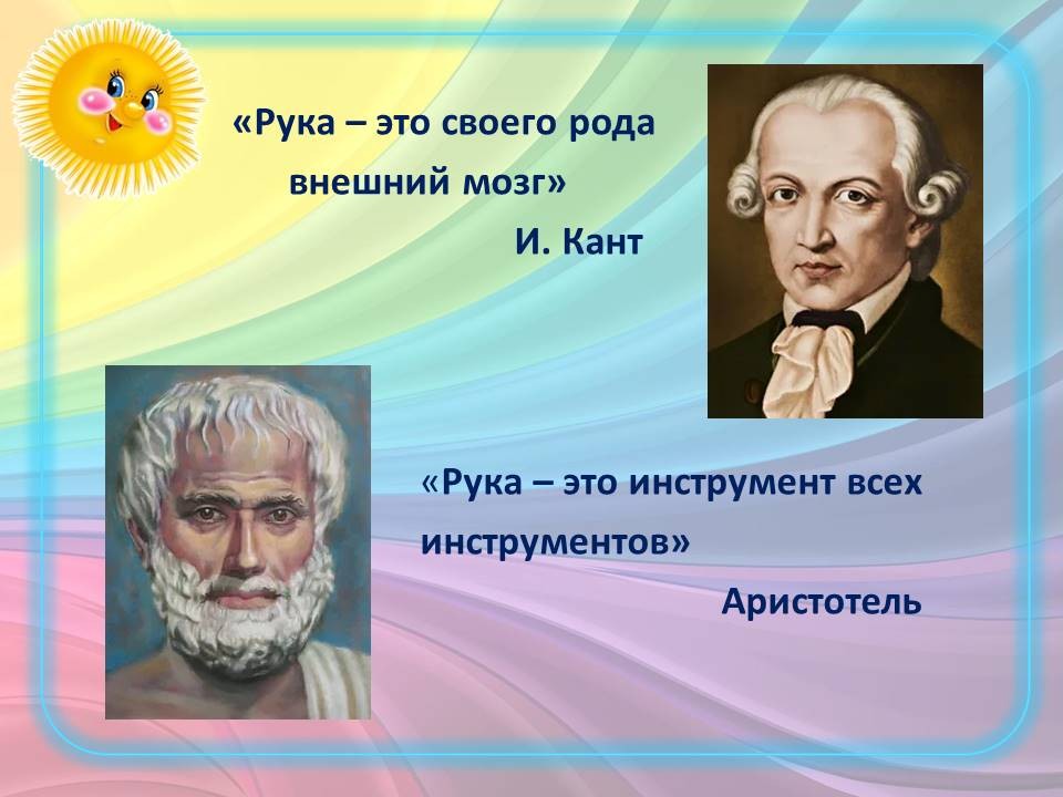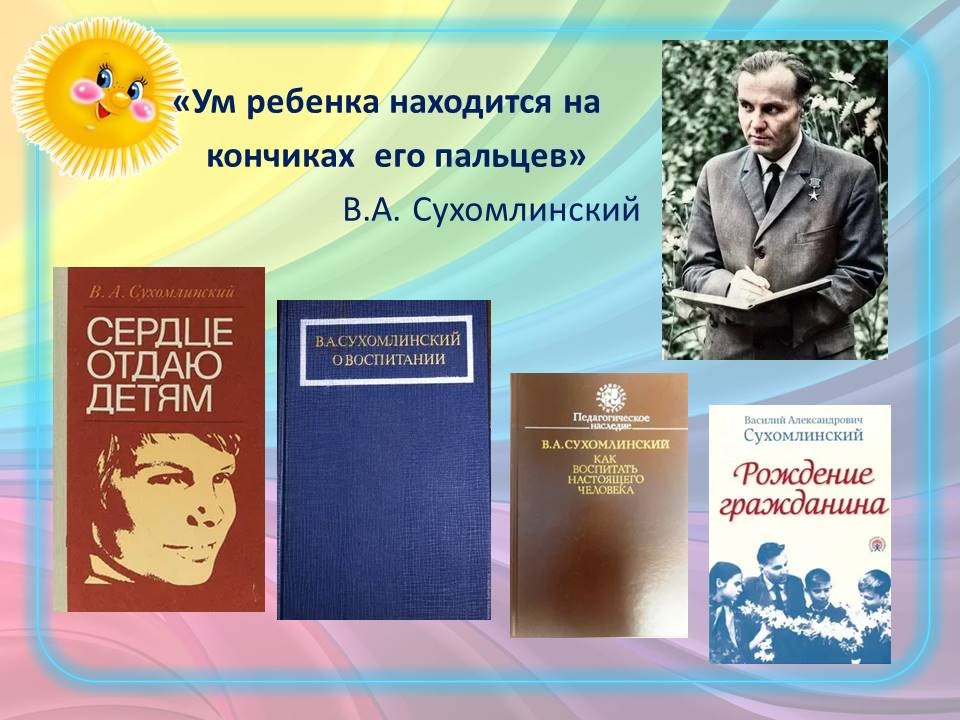 «Истоки способностей и дарований детей — на кончиках пальцев. От них идут тончайшие ручейки, которые питают источник творческой мысли. Другими словами: чем больше мастерства в детской руке, тем умнее ребенок».