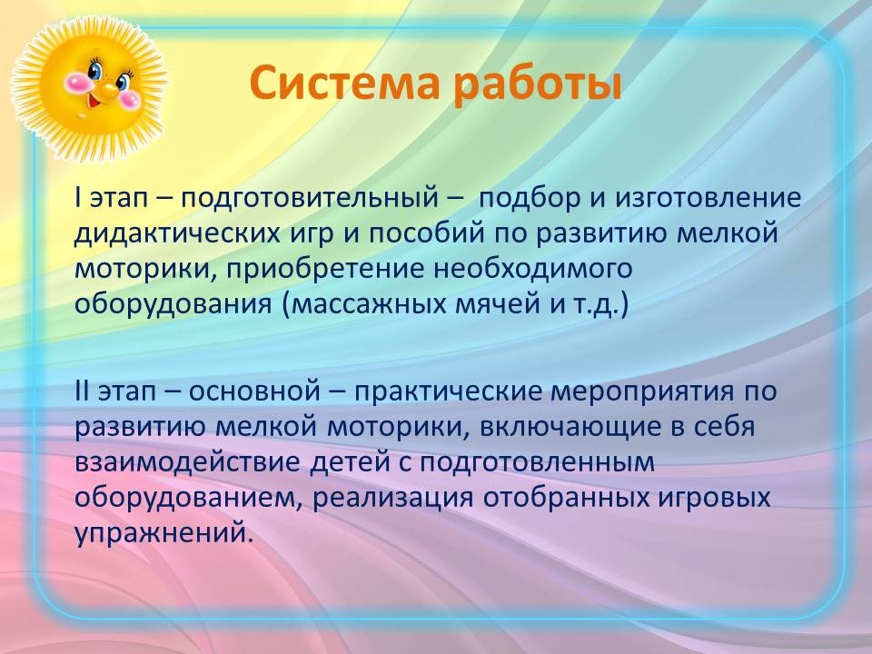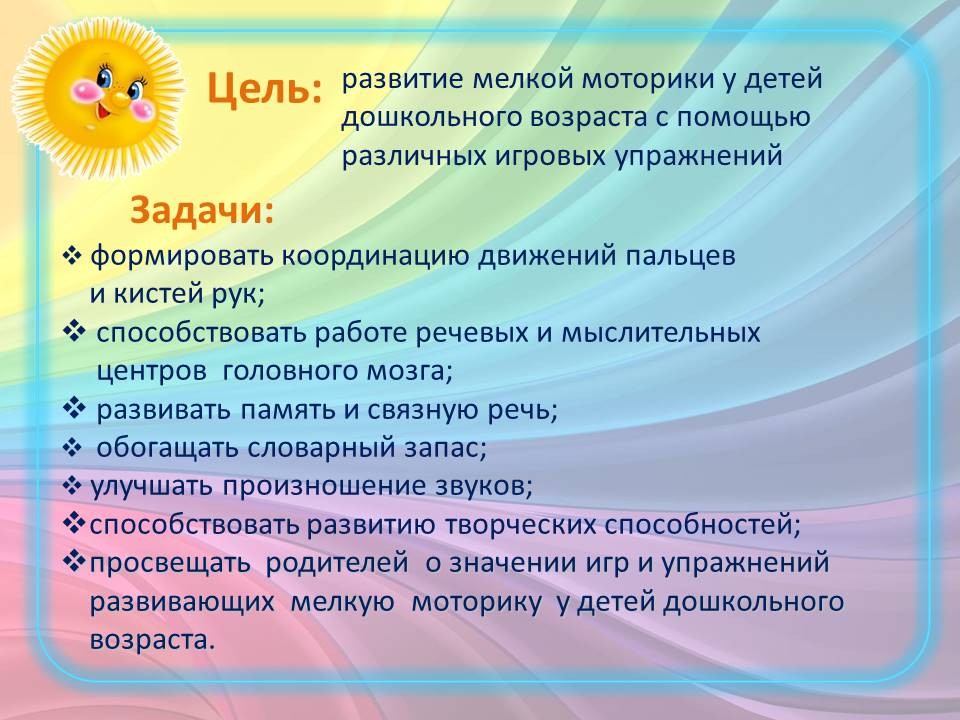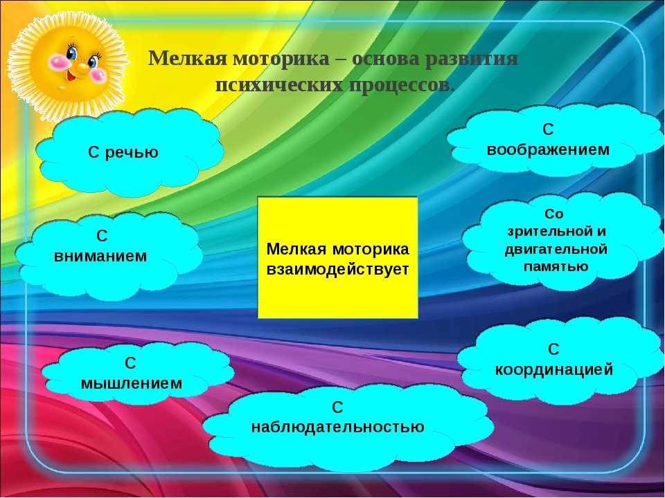 Таким образом, можно сделать вывод, что движение пальцев и кистей рук имеют особое развивающее воздействие. Моторный уровень является базовым для дальнейшего развития высших психических функций: восприятия, памяти, внимания, воображения, мышления и речи. Целенаправленная, систематическая и планомерная работа по развитию мелкой моторики рук у детей дошкольного возраста во взаимодействии с родителями способствует формированию интеллектуальных способностей, положительно влияет на речевые зоны коры головного мозга, а самое главное – способствует сохранению физического и психического здоровья ребенка.