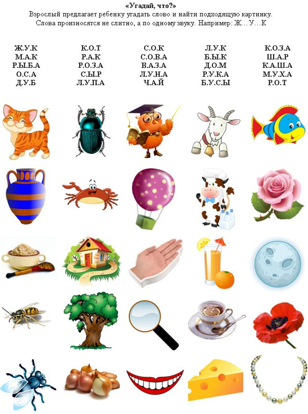 Детям дается задание придумать как можно слов на заданный звук. Один из вариантов игры – перед детьми большое количество предметных картинок, им надо выбрать те, названия которых начинается на конкретную фонему.