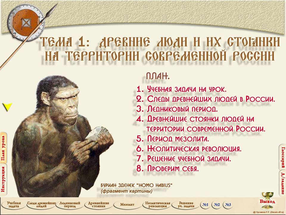 (На интерактивную доску выводится слайд №1 с темой, планом урока и фрагментом картины Буриана З. «Homo habilis»)