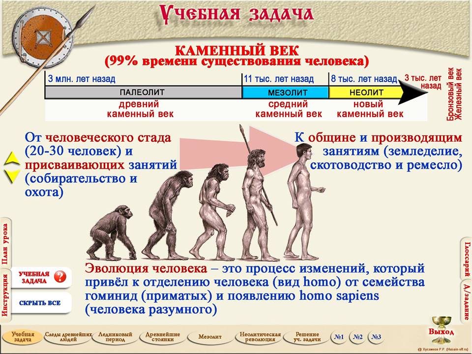 (На интерактивную доску выводится слайд №2 с Лентой времени периода каменного века, определением понятия «эволюция человека» и информацией изменения коллективов людей и занятий в ходе эволюции)