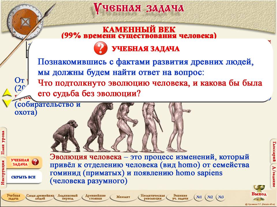 Учебная задача: Познакомившись с фактами развития древних людей, мы должны будем найти ответ на вопрос, что подтолкнуло ЭВОЛЮЦИЮ ЧЕЛОВЕКА, и какова бы была его судьба без эволюции?