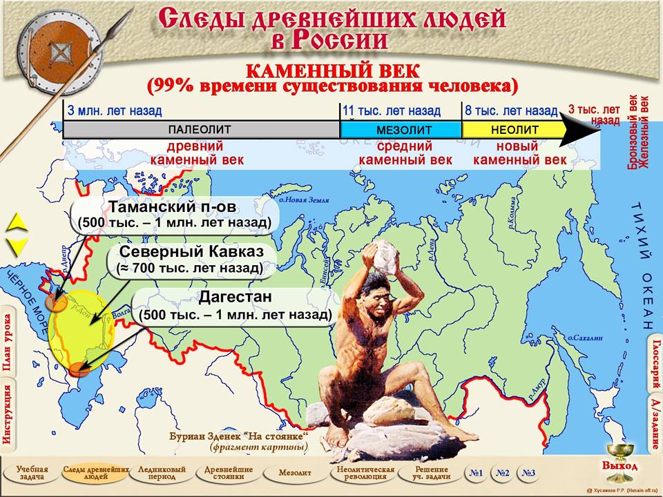 (На интерактивную доску выводится слайд №3 с картой «Древнейшие стоянки на территории России», лентой времени периода каменного века и фрагментом картин Буриана З. «На стоянке»)