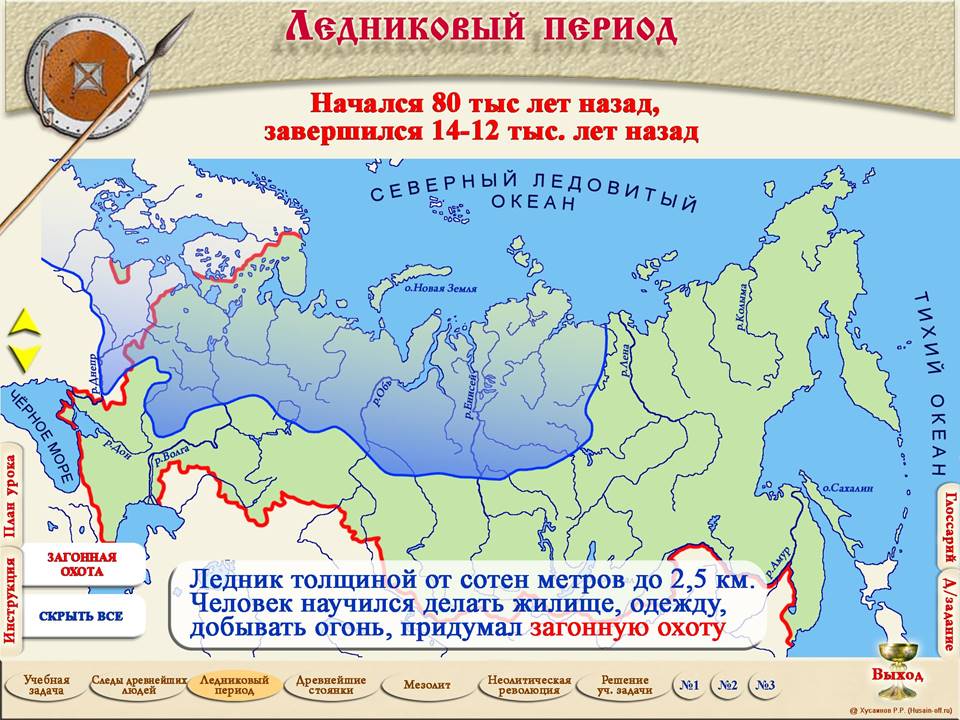 (На интерактивную доску выводится слайд №4 с картой «Ледник на территории России» с исторической справкой о хронологических рамках ледникового периода и основных фактах изменений в жизни людей)