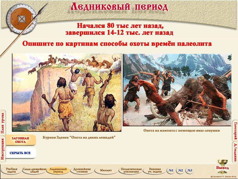 (С помощью кнопки-триггера «Загонная охота» на слайд презентации выводятся картины «Охота на диких лошадей», «Охота на мамонта» и задание «Опишите по картинам способы охоты времён палеолита»)