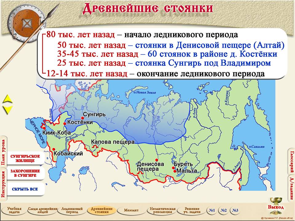 (На интерактивную доску выводится слайд №5 с картой «Древнейшие стоянки на территории России в ледниковый период» и исторической справкой о наиболее значительных из них)