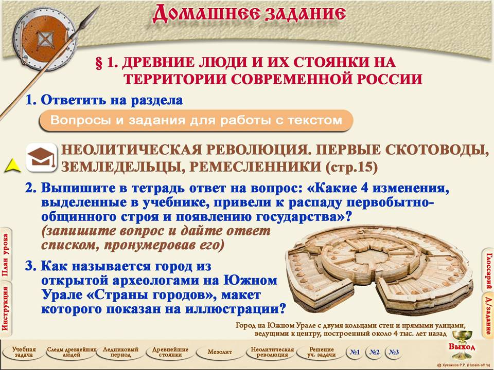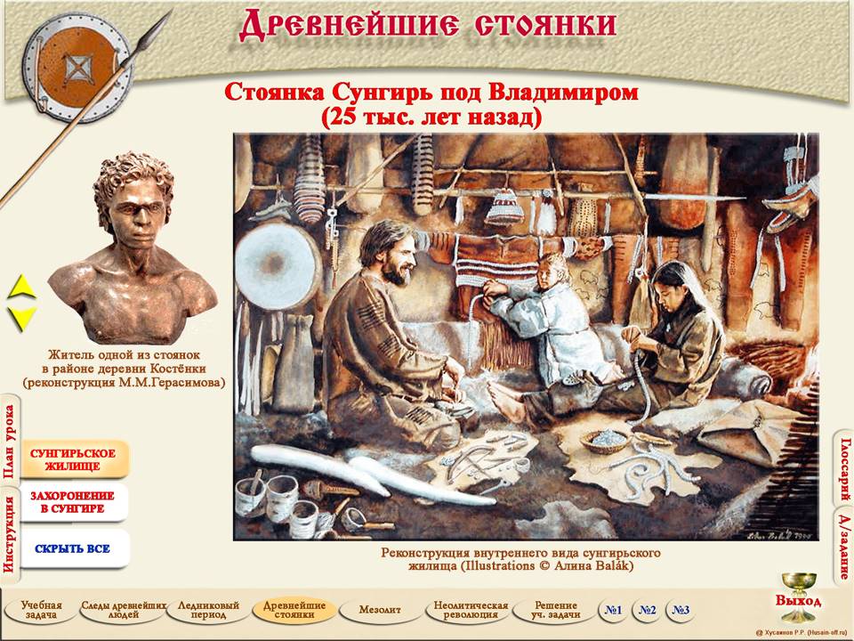 (С помощью кнопки-триггера «Сунгирьское жилище» на экран выводится иллюстрация с реконструкцией внутреннего вида верхнепалеолитического сунгирьского жилища с его обитателями (Illustrations © Алина Balák) и реконструкцией Герасимова М.М. «Житель одной из стоянок в районе деревни Костёнка»)