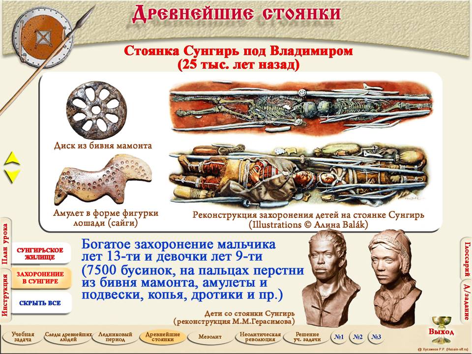 (С помощью кнопки-триггера «Захоронение в Сунгире» на экран выводится иллюстрация с реконструкцией захоронений детей на стоянке Сунгирь, и изображения диска из бивня мамонта и фигурки лошади, реконструкцией Герасимова М.М. «Дети со стоянки Сунгирь» и исторической справкой по захоронению)