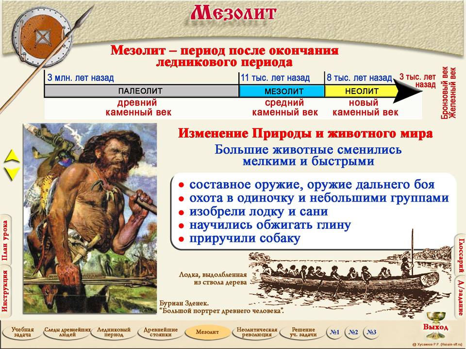 (На интерактивную доску выводится слайд №6 с Лентой времени периода каменного века, картиной Зденека Буриана «Большой портрет древнего человека», изображением лодки, выдолбленной из ствола дерева и исторической справкой об изменениях в жизни человека)