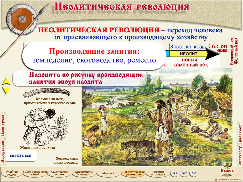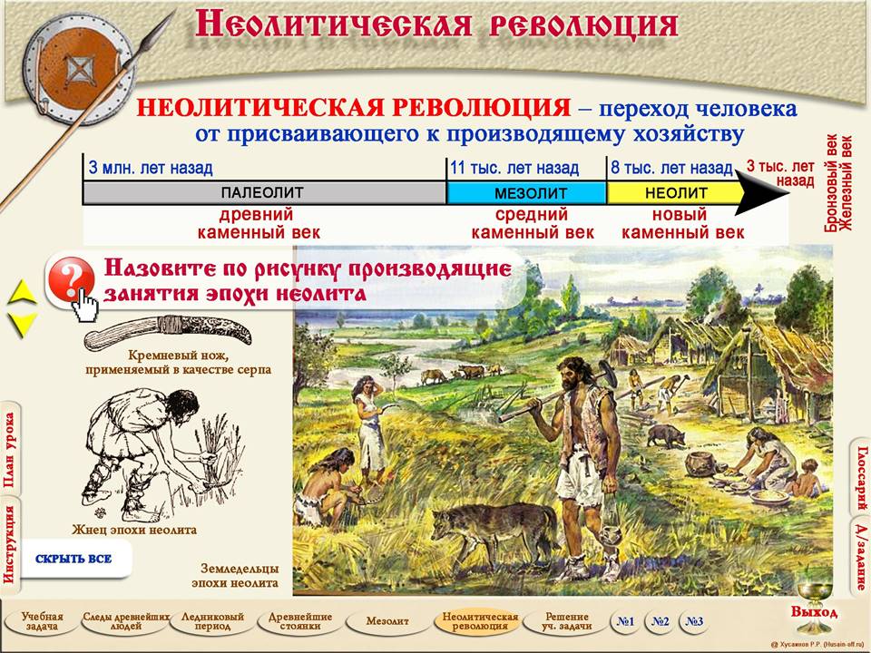(На интерактивную доску выводится слайд №7 с Лентой времени периода каменного века, определением понятия «неолитическая революция», картиной «Земледельцы эпохи неолита», рисунками «Жнец эпохи неолита» и «Кремневый нож, применяемый в качестве серпа», и вопросом-триггером «Назовите по рисунку производящие занятия эпохи неолита?»)