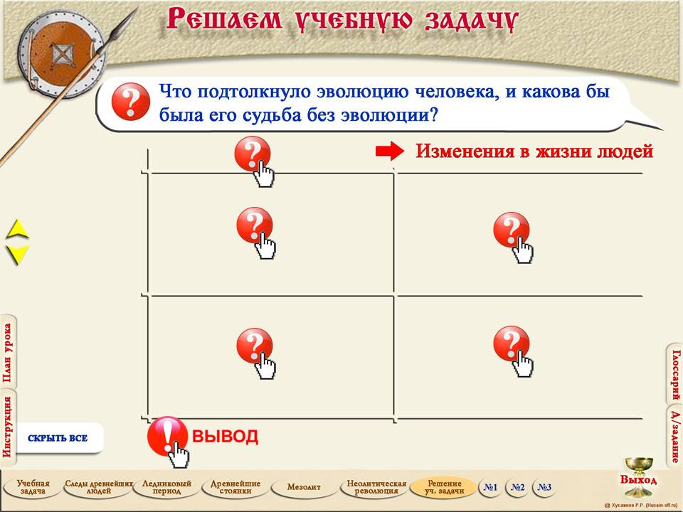 (Нажатие триггеров со знаками выводит две причины эволюции человека, связанные с изменениями в природе: «Ледниковый период» и «Окончание ледникового периода», и триггеры для заполнения таблицы)