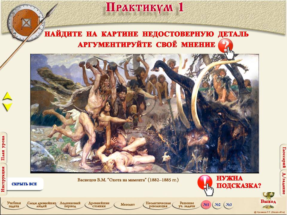 (На интерактивную доску выводится слайд №9 с картиной Васнецова В.М. «Охота на мамонта» и заданием «Найдите на картине недостоверную деталь. Аргументируйте своё мнение»)