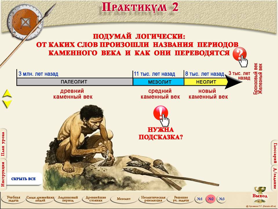 (На интерактивную доску выводится слайд №10 с заданием «Подумай логически: от каких слов произошли названия периодов каменного века и как они переводятся?» и Лентой времени периода каменного векам)