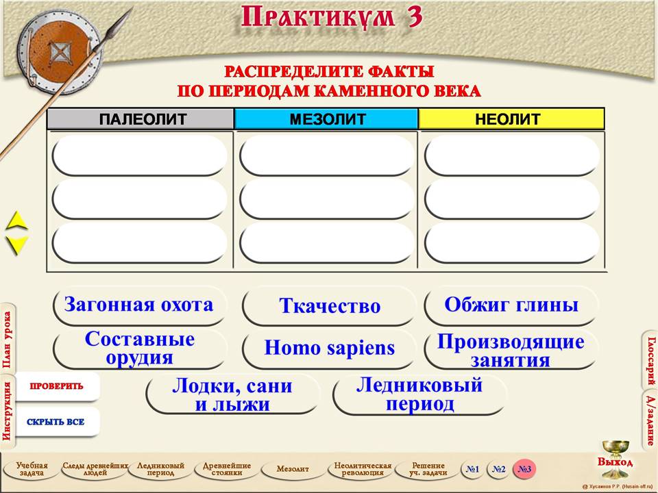 Учащимся предлагается переместить различные факты из периода каменного века в соответствующие разделы: «Палеолит», «Мезолит» и «Неолит».