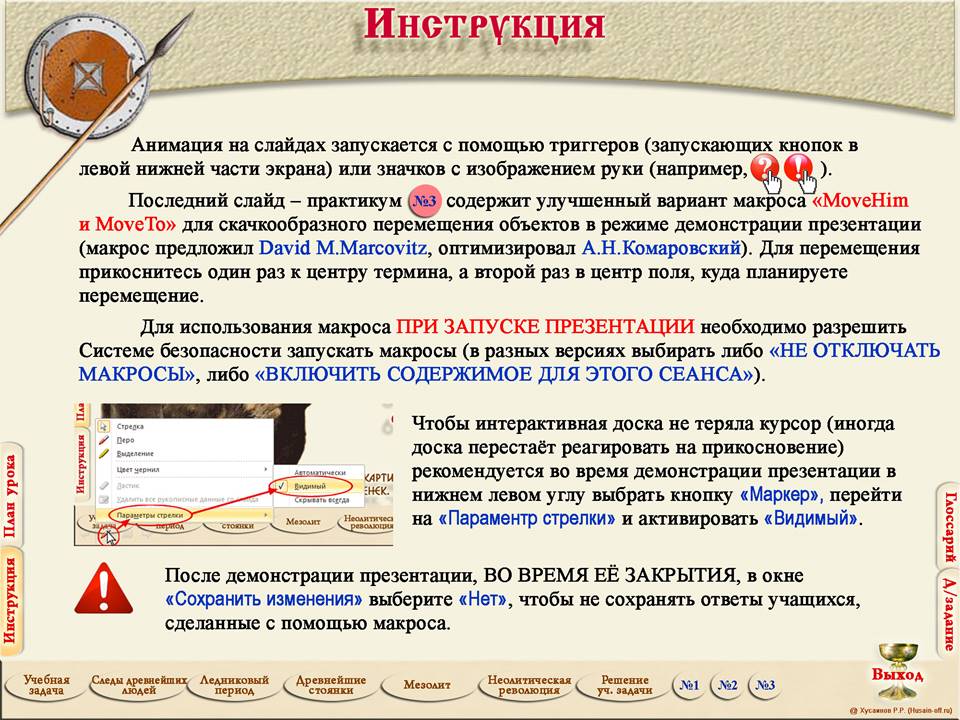 Важно! После скачивания презентации перед использованием скопировать ее из папки «Загрузки» в новую папку (без копирования файла не всегда срабатывают макросы презентации). После запуска презентации при предупреждении системы безопасности необходимо разрешить запуск макросов (подробнее в разделе «Инструкция» самой презентации).