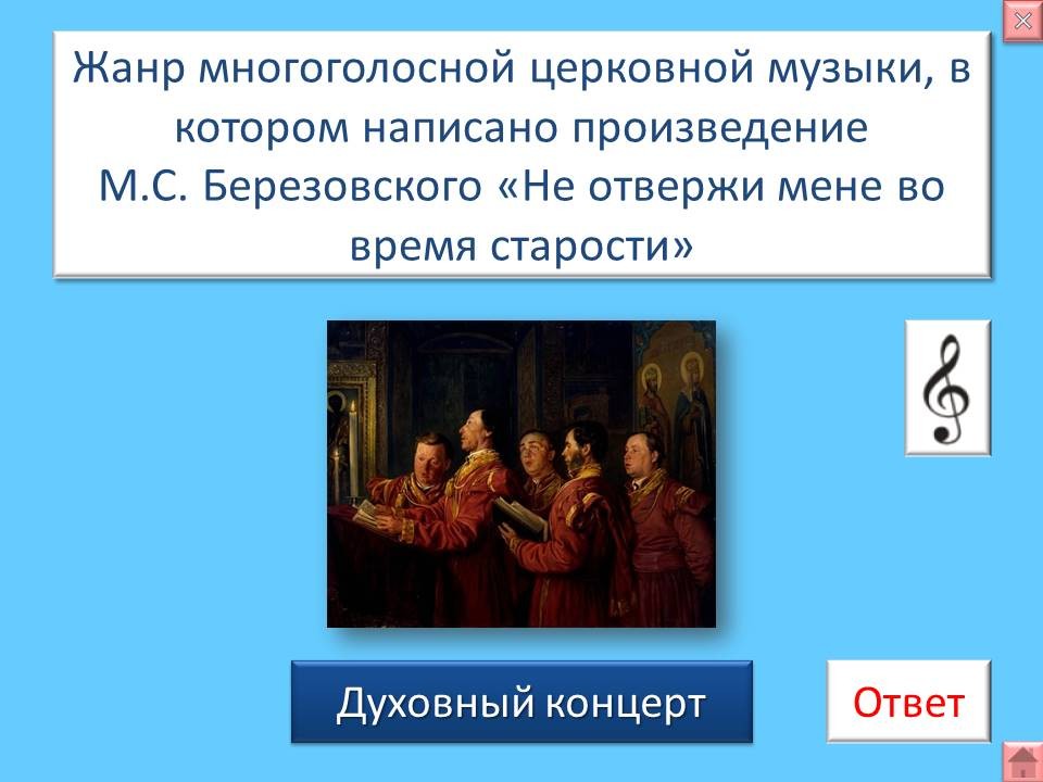 - приводить примеры сочинений духовной музыки, называть их автора» [1].
