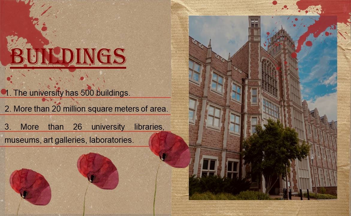 (Slide 8) The university has 500 buildings and more than 20 million square meters of space, including more than 26 university libraries, museums, art galleries, laboratories, lecture halls and conference centers.