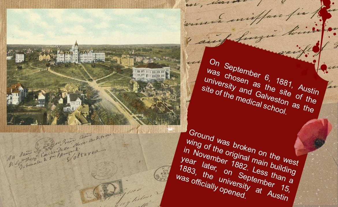(29 slide) On September 6, 1881, Austin was chosen as the site of the university and Galveston as the site of the medical school.