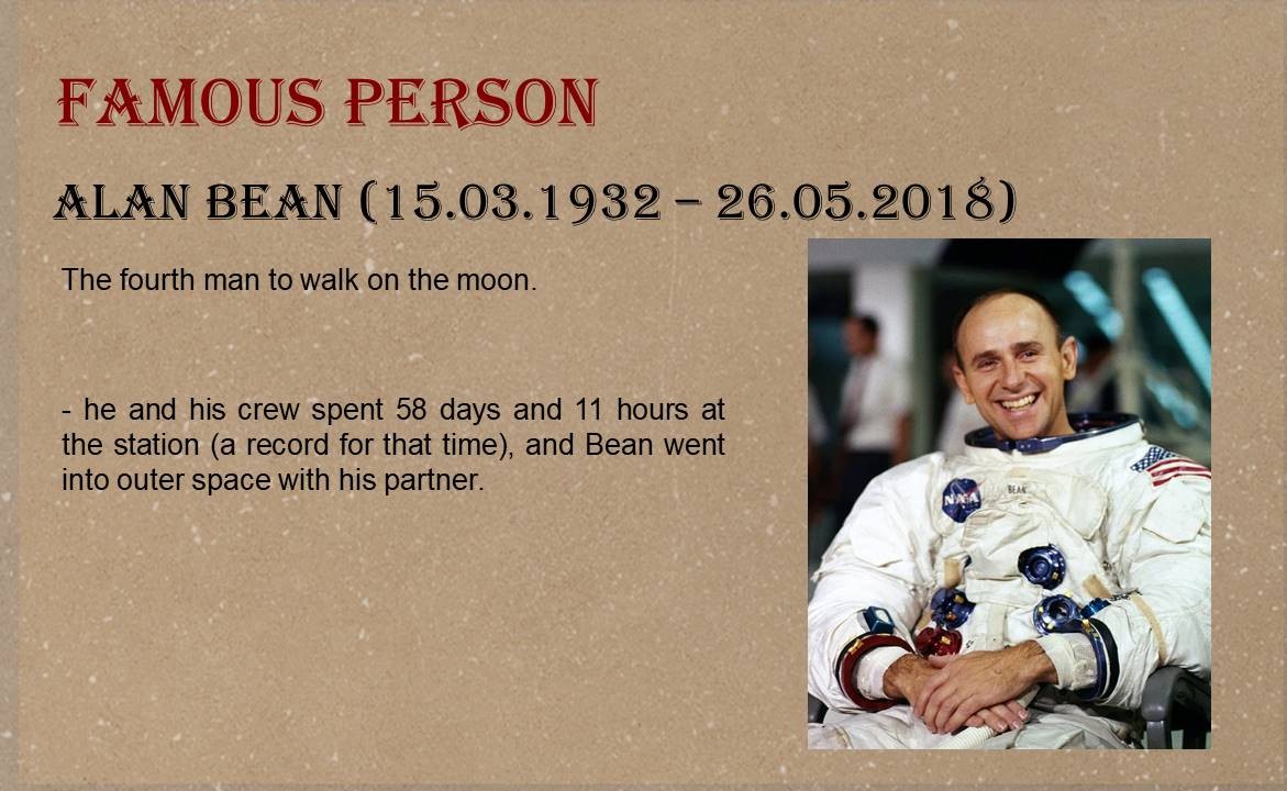 - Who are we talking about: "he and his team spent 58 days and 11 hours on the station, and he went into outer space with his partner" (Alan Bean)